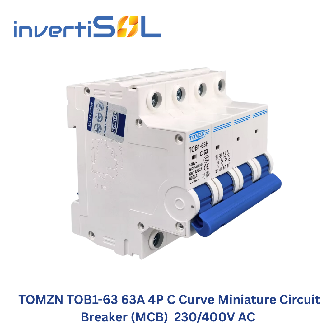 Protect your electrical systems with the TOMZN TOB1-63 4P 63A MCB. This DIN rail-mounted miniature circuit breaker offers reliable overload and short circuit protection for 230/400V AC systems. Ideal for residential, industrial, and solar applications. C Curve for moderate inductive loads.